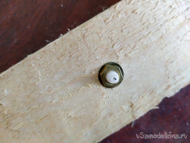 Когда отверстие готово, делаем примерку, чтобы убедиться, что лобзиком вырезали достаточное углубление. Гайка должна закрутиться на резьбе. Как собирать механизм, я еще опишу позже.