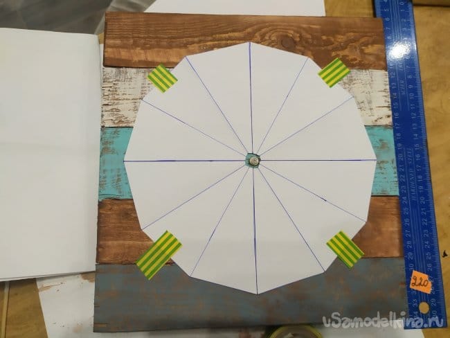 Когда трафарет готов, прикладывает его к середине, для удобства можно одеть механизм. Выравниваем и приклеиваем, чтобы не сдвинулся.