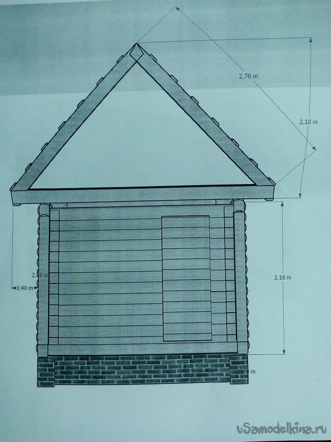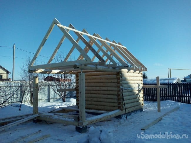 Опять же вернемся к проектному чертежу. Для экономии материалов и денег высоту конька можно делать низкую. Но в моем случае так как мансарду решил не делать, а чердачное пространство использовать только в хозяйственных целях и контроле за печной трубой конек «вытащили» на 220 см. При таких размерах геометрия бани выглядит (по моему мнению) симпатичнее, да и «полезная» высота чердака будет около180 см.