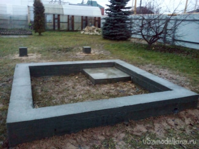 Пришлось сколотить за забором, у дороги отдельный короб для временного хранения бетона в процессе заливки проложенный пленкой. На место подвозили на садовой тачке.