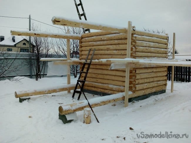 В процессе подъема сруба, устанавливаем временные леса, для удобства работы.