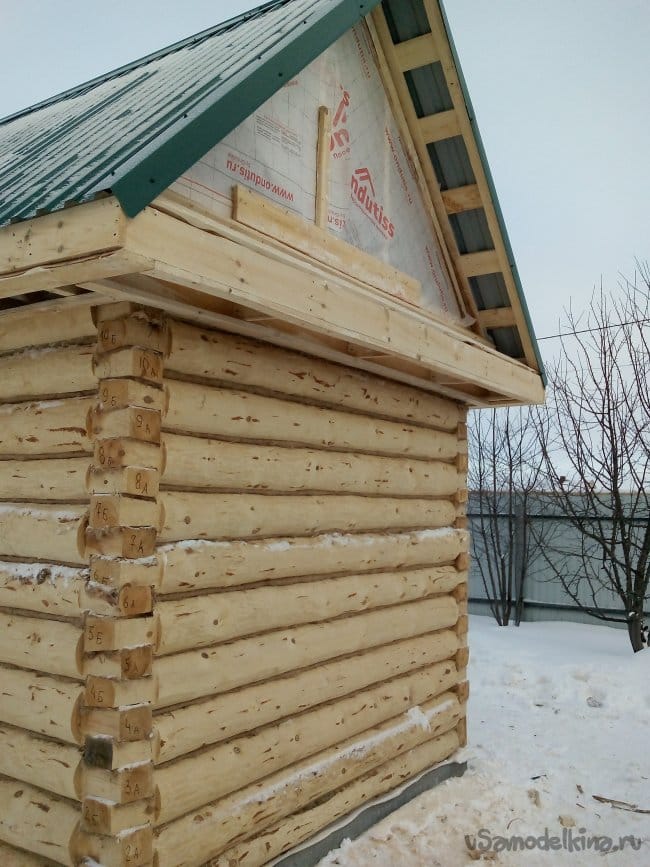 При размере сруба высотой 2200 мм в идеале (без меж бревенчатой прокладки), а на самом деле «вырос» до 2500 с лишним + высокий фундамент, даже если внутри будет подниматься уровень пола песчаной подушкой и армированной стяжкой, учитывая усадку, усушку и т.д., будущий уровень потолка получился очень высок (для бани).