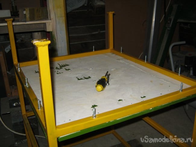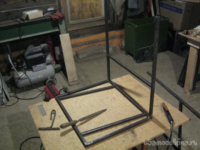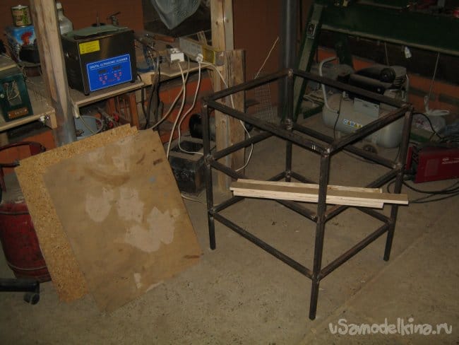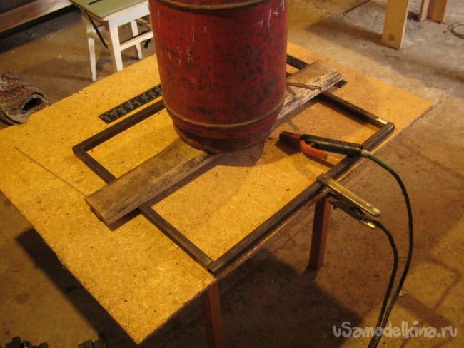При сборке опять-таки удобно применение всяческих приспособлений облегчающих труд сварщика – специальных струбцин или зажимов, магнитных угольников, наконец – сварочного стола с вытяжкой. За неимением такого оборудования пришлось собирать на ненужном (но ровном) куске ДСП. Сложил прямоугольник, зафиксировал его элементы струбцинами, несколько раз проверил и поправил углы большим столярным угольником. Прижал доской с грузом – пустым газовым баллоном.