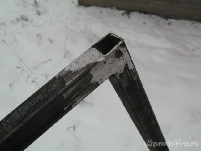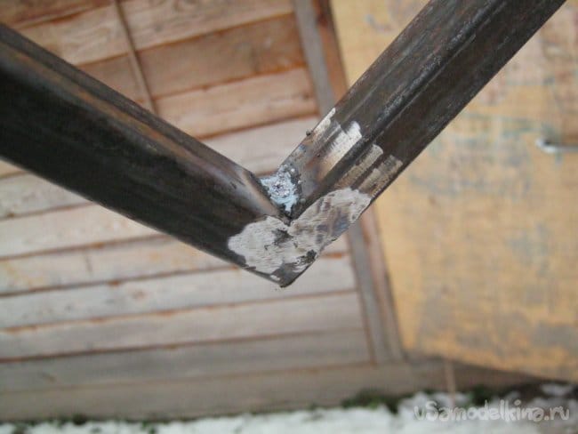 Сваривал 2 мм электродом, на обратной полярности. Ток около 40 А. Первоначально резал электроды напополам. Так не очень опытному сварщику удобнее делать мелкие точные швы, работать с тонким электродом. Освоившись работал целыми. Сборка как водится – на живую нитку, после проверки размеров и прямоугольности – тщательное сваривание и зачистка швов.
