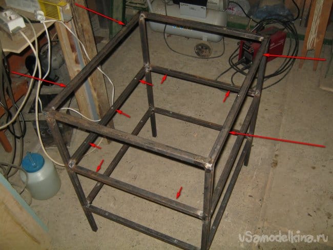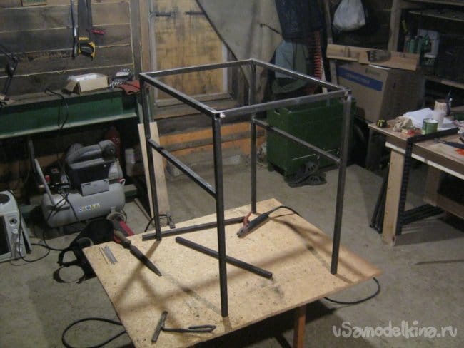Сборку вел в такой последовательности – сварил верхнюю прямоугольную горизонтальную деталь, на ней монтировал вертикальные стойки-ноги с перекладинами для полок. Первоначально планировал вварить в конструкцию и несколько раскосов или косынок для жесткости, но попрыгав на готовом столике, отказался от них – нет нужды.