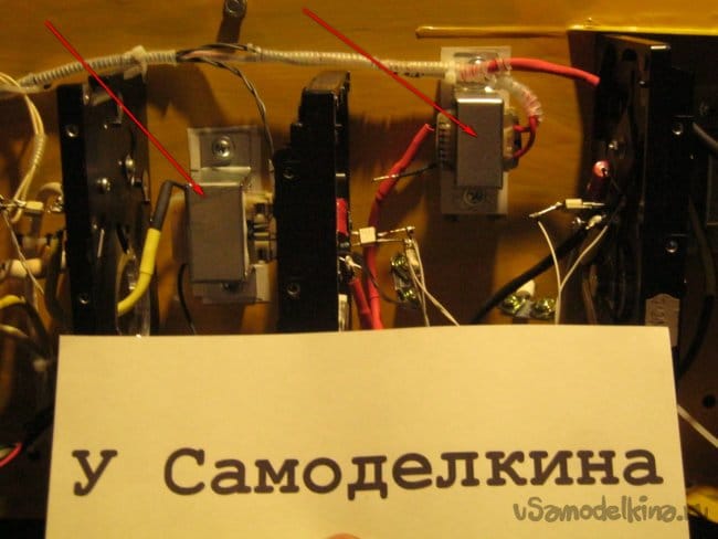 Два из трех датчиков тока в блоке управления трехфазным нагревателем печи. Индикаторные лампочки вынесены на переднюю панель, токоограничивающие резисторы смонтированы вместе с отходящими проводами, затянуты в термотрубку и скреплены вместе с остальным монтажом нейлоновыми ремешками и пластиковой спиралью.