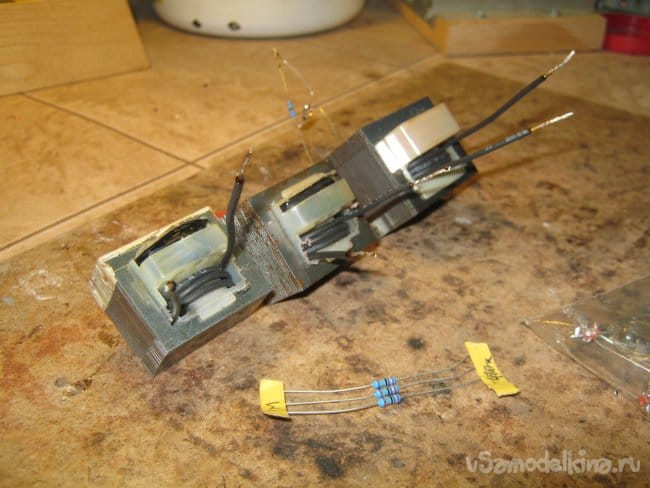 Доработка облегчилась благодаря удачной конструкции трансформаторов – в них обмотки расположены рядом, на сборном пластиковом каркасе (технологичность изготовления), а не поверх друг друга (выше эл. параметры). Доработка свелась к перемотке вторичной, низковольтной обмотки. Из-за особенности конструкции трансформаторов удалось сделать это без муторной сборки-разборки проклеенного сердечника из Ш-пластин.