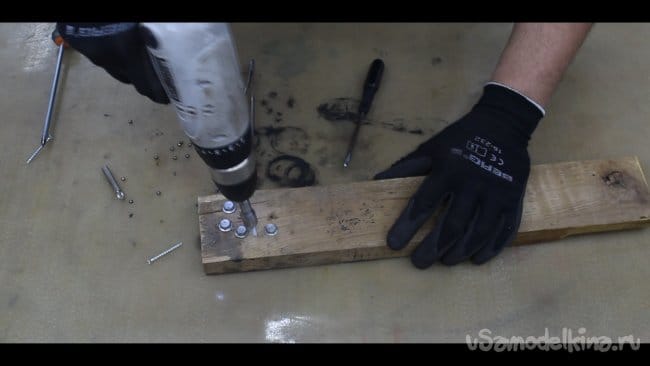 Винтики подбирал на глаз из того, что было в гараже и они отлично подошли на место шариков, таким образом механизм трещотки будет заклинен и шуруповерт будет отлично работать без трещотки на полном усилии