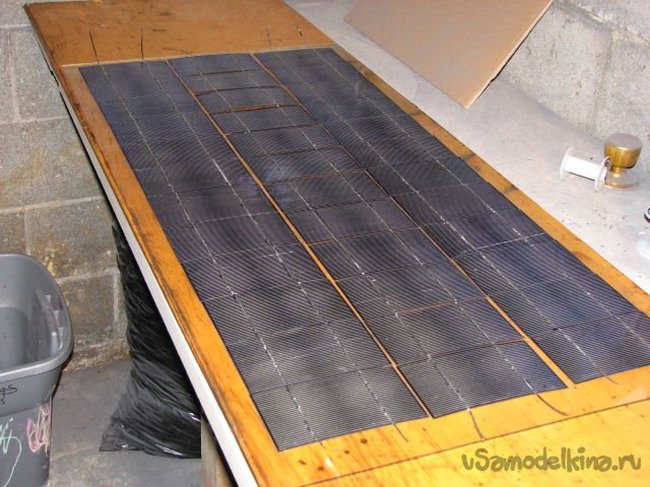 Солнечные батареи спаяны в ряды. Я выложил ряды батарей с противоположными концами. Скажем, один ряд, вверху будет +, а следующий - в верху будет - - и так далее. Я приклеил все ряды на стекло с помощью силикона. Вы можете соединить все ряды плоским проводом 5 мм.