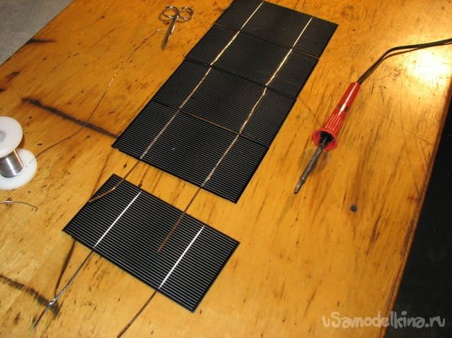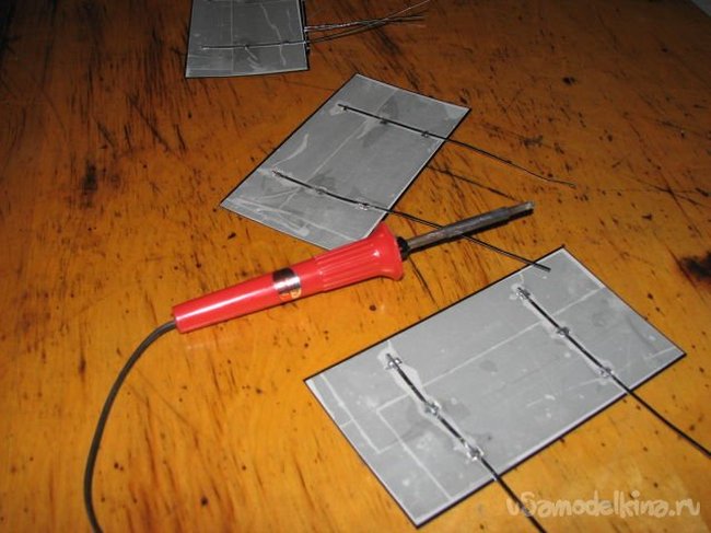 Когда я паяю провода для крепления солнечных батарей, сначала я нарезаю проволоку на куски нужного размера. Для одной батареи нужно два куска проволоки длиной 15 см. Я припаиваю их к задней стороне каждой батареи.
