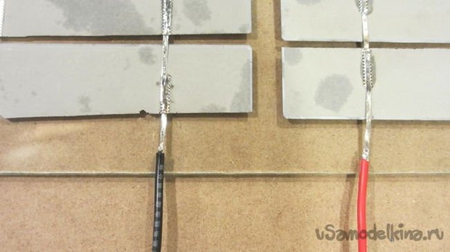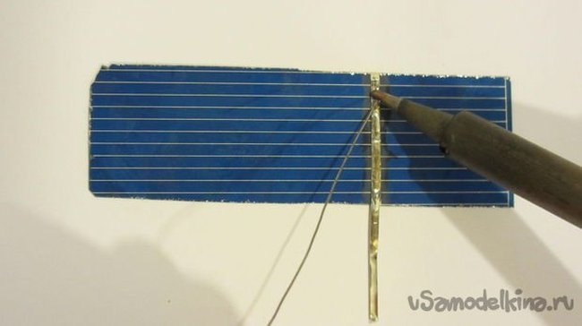 Вот так я пропаял каждый фотоэлемент полторадюймовыми кусочками проводника. Я использовал 60-ваттный паяльник при температуре 400∘С. Нужно пропаять 16 таких фотоэлементов.