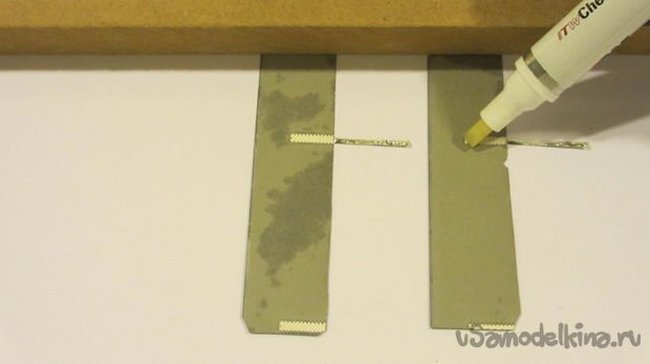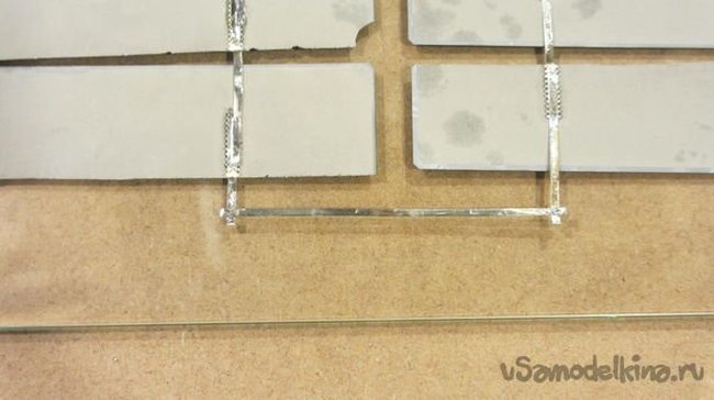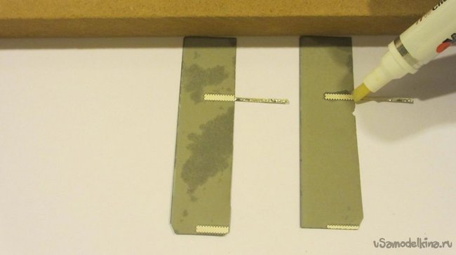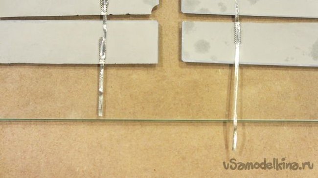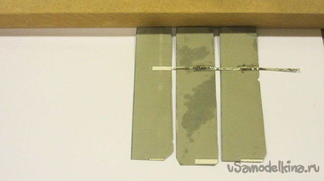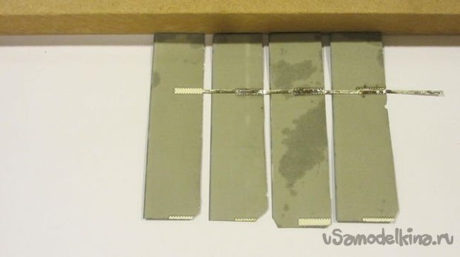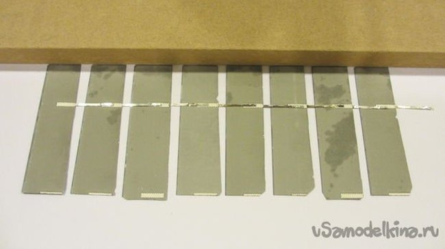 Аккуратно перенесите две полоски фотоэлементов с рабочей поверхности на лист стекла. Убедитесь, что они расположены на стекле, как показано на втором фото, синей стороной к стеклу. Подойдет практически любое стекло. У меня листы 25 х 20 см, толщиной 3 мм.