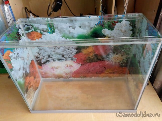 У меня на работе, во многих офисах, есть аквариумы с многообразными рыбками. Все говорят что они помогают снимать нервозность, раздражение и стресс. Вот и я решил завести себе питомцев. Дорогих рыбок я не потяну, цена бьёт по карману. Решил, обычным сачком, отловить вдоль берега пруда, какую-нибудь рыбку. Попалось 16 мальков карасей. Я был очень доволен. Мне сказали, что они не прихотливые и очень живучие. Стал думать, в каком аквариуме их содержать, куда ставить аквариум, какие прибамбасы нужны к аквариуму. Сперва просто, ознакомительно установил аквариум на письменный стол и наблюдал. Получилась фигня. Мама настаивала на демонтаже всего что я наворотил. Но, после того, как я ей предложил свой проект по новому использованию секретера, который она собиралась выбросить, всё резко изменилось. Я попросил дать мне некоторое время на подготовку проекта и она обещала смотреть, как говорят сквозь пальцы, на всё что я буду делать. Первым делом я обклеил специальной плёнкой три стороны аквариума, оставил только переднюю часть.