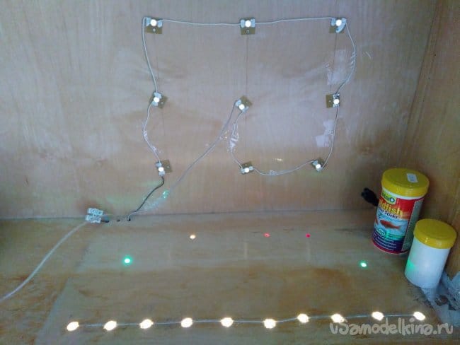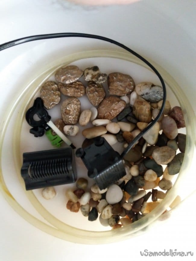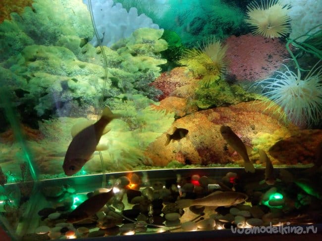 Получалось так, что яркость можно было изменять в достаточных пределах и светодиоды при этом совсем не грелись. Выключатели активного фильтра и компрессора, так же установлены рядом. Чтобы подсветка шла со дна аквариума, на его дне я расположил некоторое количество камней, но так, чтобы они не препятствовали прохождению света. Для подачи нескольких струек воздуха, со дна аквариума, я взял нержавеющую трубку и сделал небольшие надпилы напильником. Потом, иглой сделал прокол, чтобы отверстия были маленького диаметра.