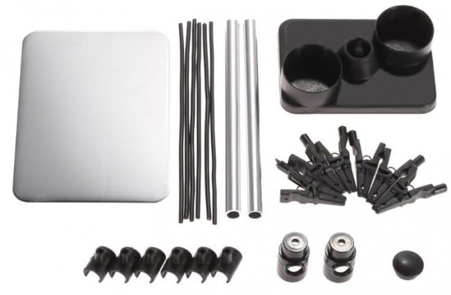Особенно пригодится такая подставка людям, увлекающимся моделированием. С ее помощью можно выполнить аккуратное и равномерное окрашивание всевозможных элементов малых размеров. По своей сути данный держатель представляет собой зажимы типа «крокодил», зафиксированные на гибких и держащих заданную форму проводах в черной изоляции, которые в свою очередь фиксируются на двух, свободно вращающихся друг относительно друга, алюминиевых трубках посредством С-образного зажима. «Крокодильчики» изготовлены из качественного пластика, в меру тугие, детали удерживают надежно и не повреждают их, так как зубчики у «челюстей» имеют закругленную форму. Основание подставки состоит из двух элементов: пластиковой формы с двумя емкостями и металлической основы, на которой вся конструкция надежно держится за счет мощных магнитов.