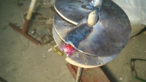 Для того, чтобы закрепить кольца на шпильке, я решил использовать стальную полосу, приваренную диаметрально поперёк кольца. Для этого я сделал в кольцах выборки, чтобы утопить полосу заподлицо: