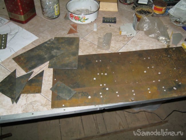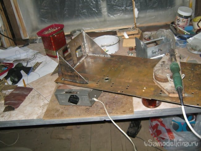 Монтаж передней и задней стенок с треугольниками-подкосами сделал пайкой. Использовал обычный ПОС-60 и кислотный витражный флюс, но по стали хорошо работают и «паяльная кислота» (хлористый цинк) и кислота ортофосфорная. Железки массивные, кроме мощного паяльника лучше применить и дополнительный подогрев. Здесь применена лабораторная электрическая плитка. Вместе с паяльником 150 Вт они прекрасно справились с задачей. Подогрев газовой горелкой или строительным феном менее удобен и может привести к короблению тонкого металла. После пайки не откладывая, следует отмыть остатки флюса. Теплой водой со щеткой, а лучше слабым раствором соды.
