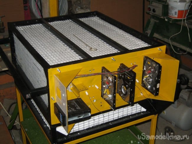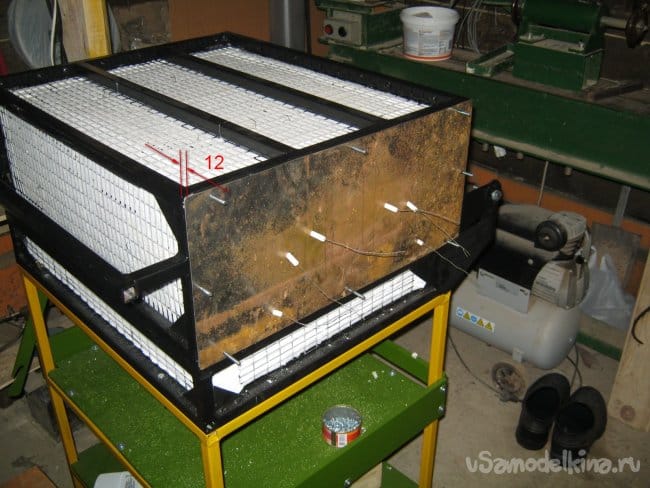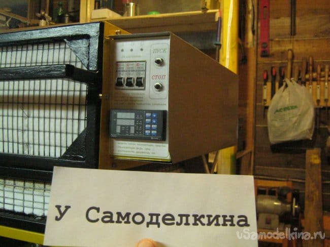 Все промежуточные соединения проволочных нагревателей внутри рабочей камеры (сварены), наружу выходят только выводы групп, контролировать целостность всех этих соединений и самих нагревателей позволяют самодельные трансформаторные датчики тока с индикаторами на передней панели блока.