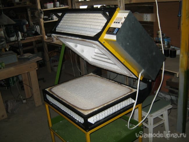 Процесс спекания довольно сложен и содержит 7…8 ступеней. Каждая ступень предполагает выдержку заготовки с определенной температурой заданное время, кроме того, чрезвычайно важна скорость изменения температуры между ступенями. Небольшие заготовки позволяют обходиться упрощенным графиком спекания, при этом изменения между несколькими ступенями можно делать вручную по таймеру. Оборудование для таких работ тоже может быть довольно простым. При этом (небольшие линейные размеры) возникающие внутренние напряжения не достигают разрушительных величин. С увеличением размеров заготовки повышаются и требования к изменениям и выдерживанию (подобранным экспериментально) времени и температуры. Процесс может длиться 12…16 часов. Ручное управление таким процессом затруднено, требуется программируемый термоконтроллер. Здесь, применен программируемый термоконтроллер от паяльной станции для микросхем в BGA (выводы-контактные площадки на дне микросхемы) корпусах. Конструкция корпуса не позволяет монтировать такую микросхему паяльником, ее прогревают насквозь. При этом очевидны также высокие требования к точности поддержания термопрофиля и возможность регулировать скорости нарастания и спада температур. Это роднит обе задачи, практика также показала полную пригодность такого контроллера для спекания стекол. Контроллер китайского производства прекрасно работает и много дешевле специализированных приборов.