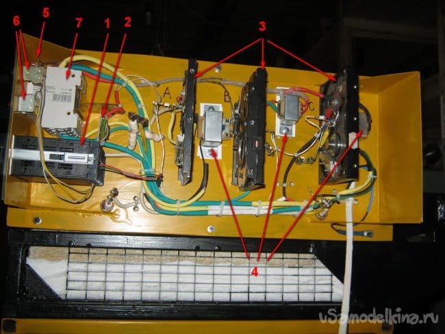 Проволочные выводы групп нагревателей соединены с нетонким медным проводом через металлическую деталь – элемент мощной винтовой клеммы. Печь управляется программируемым контроллером Altec-410 (поз.1); для сопряжения с симисторными ключами применен промежуточный модуль (поз.2) жесткие проволочные выводы которого зажаты в винтовых клеммах контроллера. Управляющий сигнал поступает на три симисторных модуля (поз.3); целостность цепей (нагревателей) контролируется трансформаторами тока (поз.4) с индикаторами на передней панели (поз.5). Для пуска и остановки программы, к контроллеру подключены внешние кнопки (поз.6) кнопка «пуск» должна при работе удерживаться в замкнутом состоянии. Трехфазное напряжение подается через автоматические выключатели (поз.7).