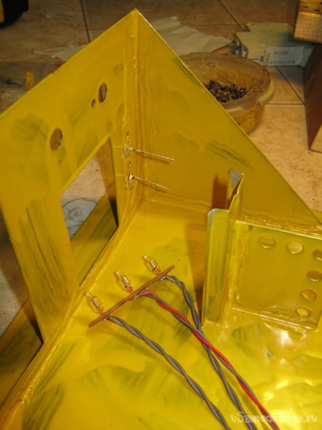 Материалы – кроме радиоэлементов понадобилась листовая сталь для корпуса прибора, кусочек оргстекла для лицевой панели, крепеж, мелочи, ЛКМ.