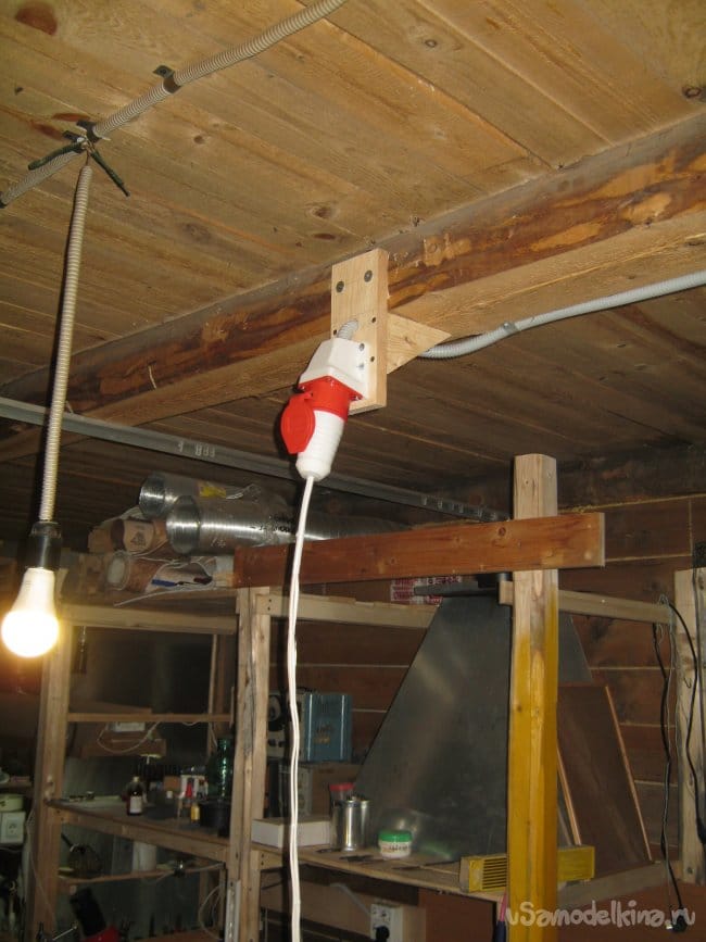 Кабель питания – пятипроводный («ноль», 3 фазы, заземление) и составлен из двух мягких проводов в двойной изоляции (2-х и 3-х жильный), соответствующего сечения. Печь стоит отдельно, розетка питания расположена на потолке.