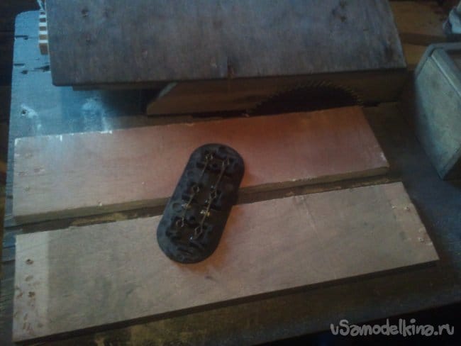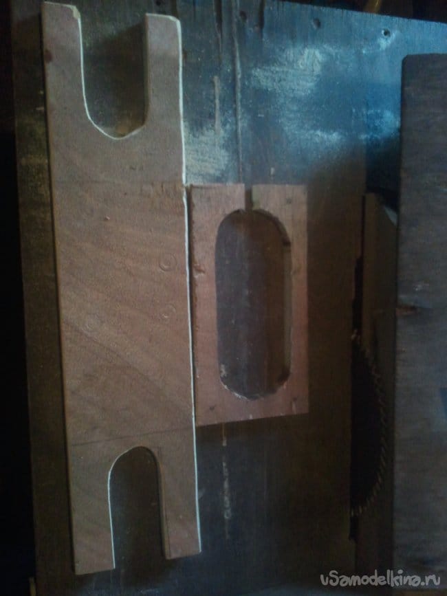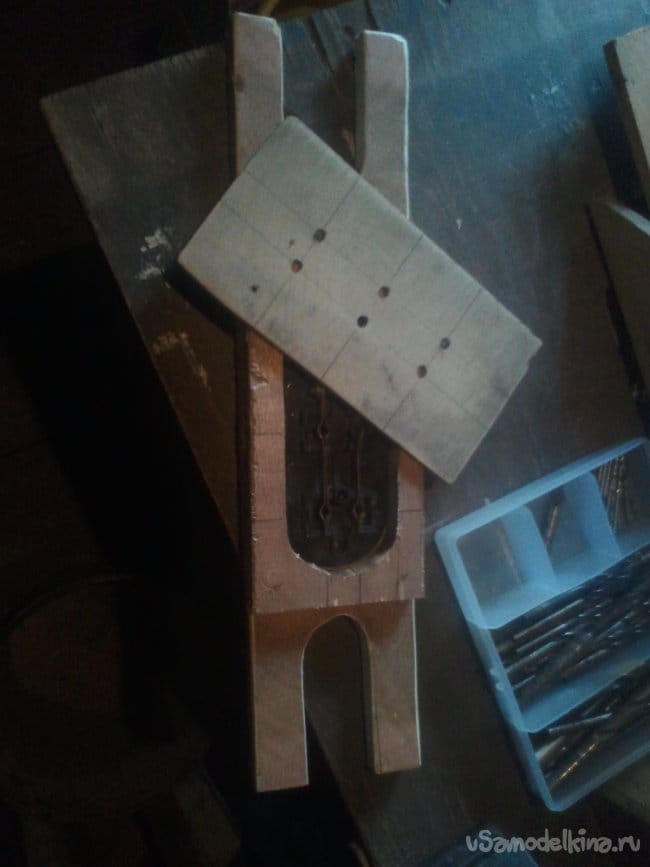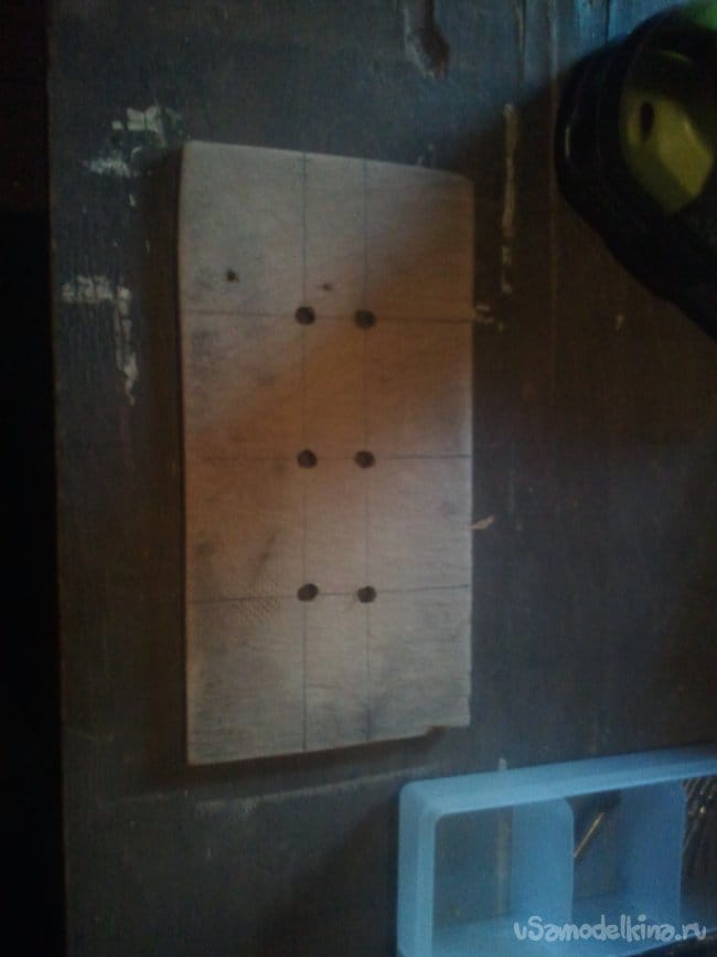 И наконец третья деталька: из обрезка фанеры, толщиной 3 мм вырезаем верхнюю крышку на розеточную часть. Делаем разметку и высверливаем три пары отверстий под штекеры вилок.