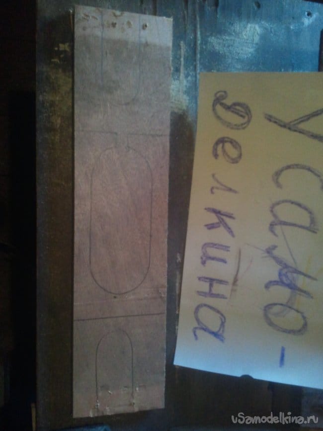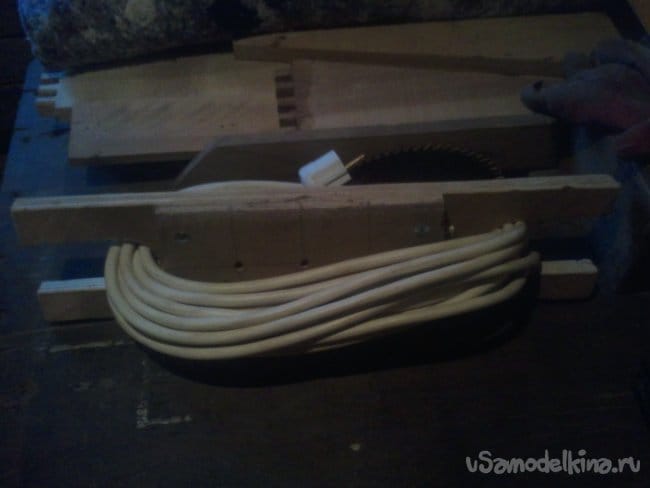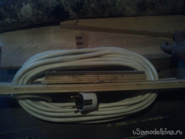 Одну полоску фанеры используем в качестве основы. Она же будет исполнять функцию приспособления для хранения провода в смотанном виде. На этой полоске необходимо сделать вот такую разметку.