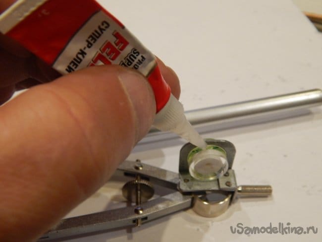 Чтобы настройка не сбивалась закрепляем глазок уровня цианакрилатным клеем, имеющим хорошую адгезию и к акрилу, из которого изготовлен уровень, и к металлу. По большому счёту нагрузки там нет.
