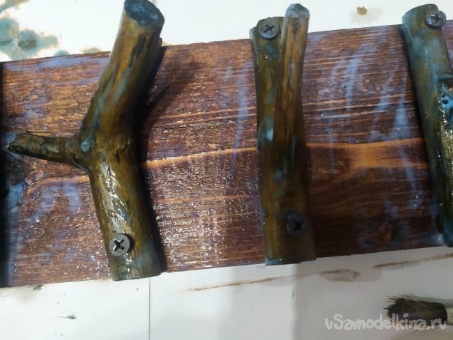 Вешалка покрашена и собрана, остается лишь закрепить результат лаком. Я использую акриловый лак, он быстро сохнет, и не имеет запаха, что очень удобно для домашних работ.