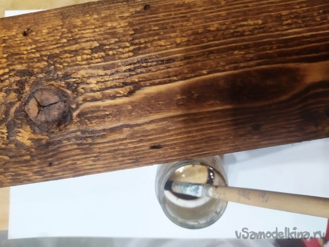 Чистой кисточкой на носим первый слой. Кстати, лучше отлить себе немного лака в отдельную емкость, так как морилка немного остается на кисточке, следовательно, можно занести морилку в банку с лаком, это немного подпортит его прозрачность.