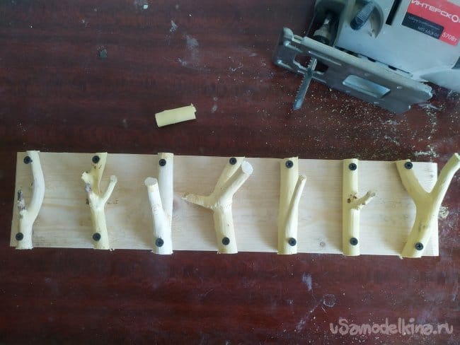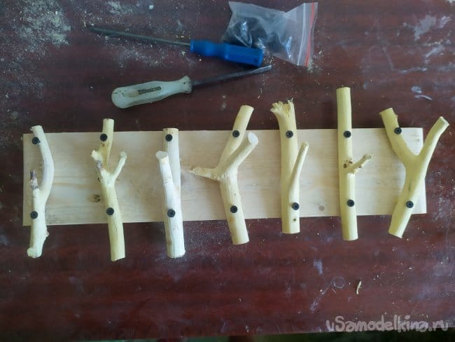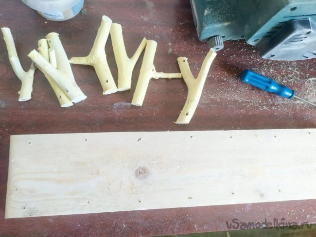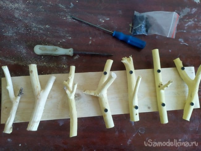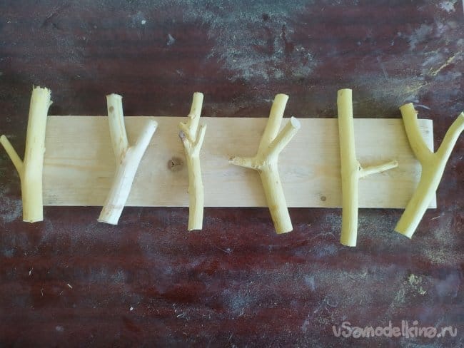 Распределяет ветки на доске, в зависимости от своего настроения. Тут важно не соблюдать каких-либо правил, главное, чтоб было удобно вешать потом на них вещи, а так, крючки могут располагаться на разной высоте, и даже смотреть в разные стороны. Это ведь природный материал, а природа не любит точность и правила. Лишние сучки и неровности станут дополнительным украшением на крючках.