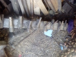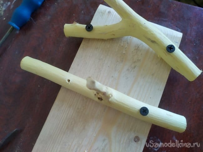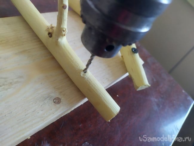 Плотно прижимаем веточку к досточке, и делаем по два отверстия, сверху, и снизу.
