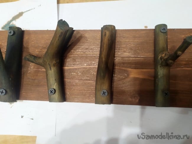 Я решила красить ветки и доску в разные цвета. Так как сорт дерева разный, то морилка по- разному проявится на доске и на крючках. Чтобы не было сюрпризов, я сразу покрашу веточки в черный, это добавит контраста, а основание будет цветом, под названием "Мик". Так же, черный цвет веток немного замаскирует черные саморезы, по моей задумке они будут спереди, и прятать их я не буду.