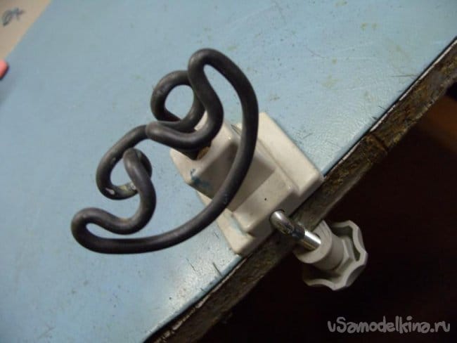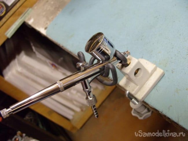 Подставку для аэрографов собрал из сломанного фиксатора лампы и толстого провода в изоляции. Загнул такую загогулину для двух инструментов.
