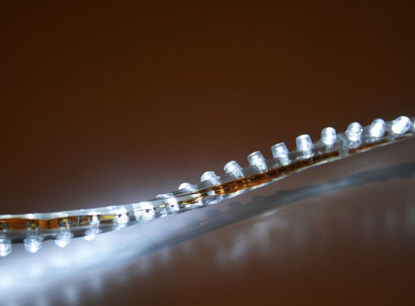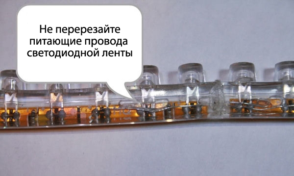При резке ленты необходимо помнить, что светодиоды на ней расположены в группах по три. На границах этих групп и следует делать разрезы, но при этом следите за питающими проводами – вы должны не разрезать их! Мы рекомендуем вам быть аккуратными и соблюдать осторожность при выполнении этой операции.