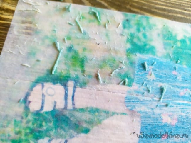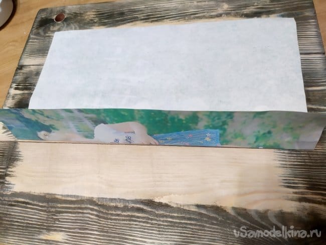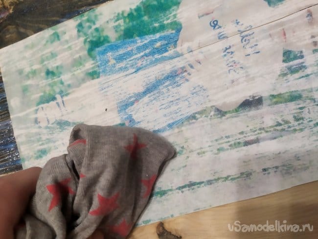 После того, как вся картинка приклеена, еще несколько минут я ее прижимаю тряпочкой, но только аккуратно, чтобы не порвать.