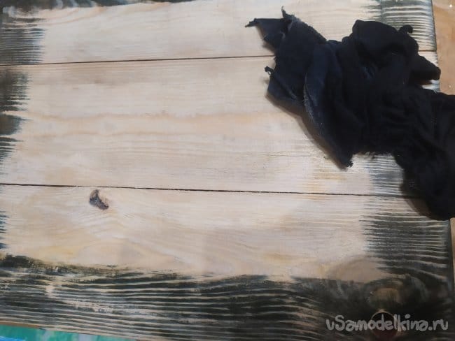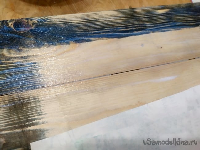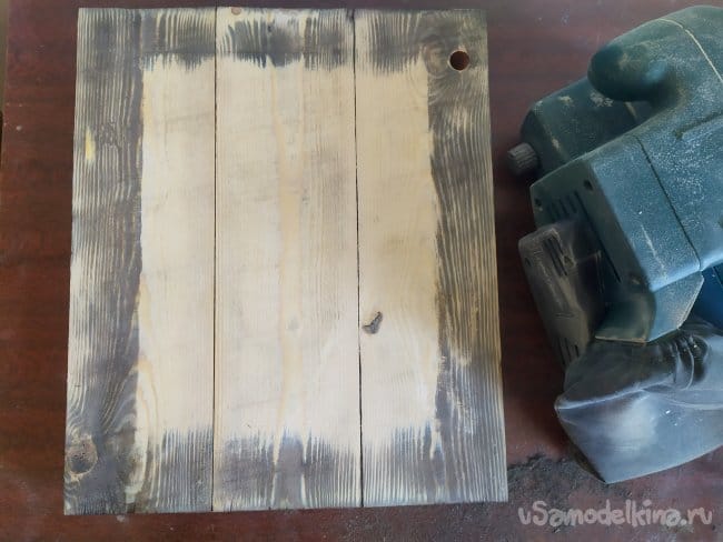 Я хочу придать дереву состаренный вид. Для этого, после высыхания морилки, я буду еще раз шлифовать всю поверхность машинкой. Разницу можно увидеть на фото.