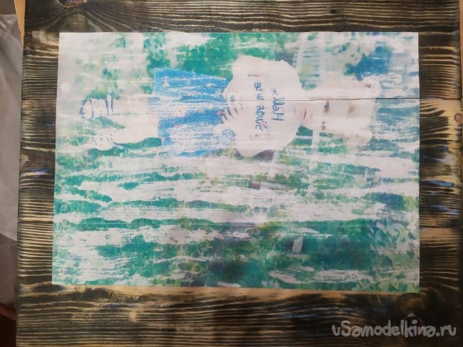 Сразу же, нужно выгнать все пузырьки. Для этого, можно использовать тряпочку. Либо, банковскую карточку. Изображение должно полностью приклеиться к доске. Затем, мажем вторую, и третью часть, полностью повторяя все действия.