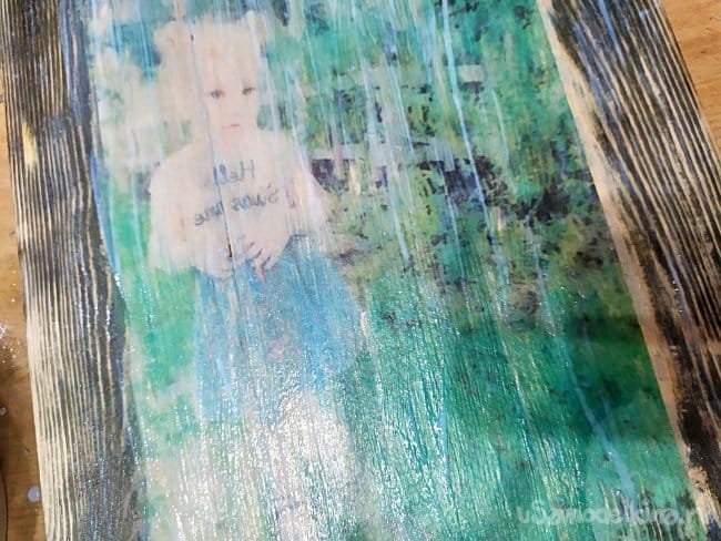 Для переноса фотографии на дерево, понадобится лак. У меня акриловый бесцветный лак. Его нужно хорошо взболтать перед нанесением, иначе может плохо приклеится. Чтобы облегчить себе работу, я буду наносить не сразу на всю поверхность, а частями. На первую досточку наношу лак.