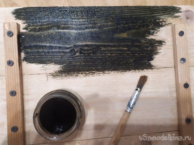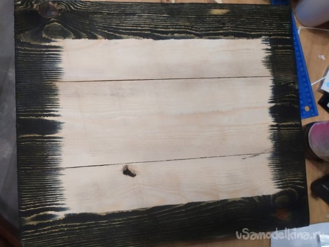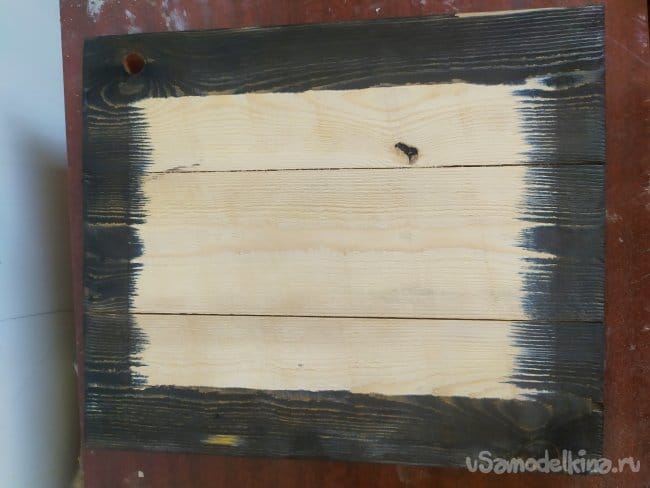Когда границы нарисованы, можно приступать к созданию рамочки. Я использую темную морилку. Наливаем ее в баночку, и кисточкой, аккуратно наносим по краям. Тут можно было бы наклеить малярный скотч, но мне не нужны идеально ровные границы. Да и морилка, впитываясь в разные слои, идет по дереву, как по каналу, и даже скотч тут бы не сильно помог.