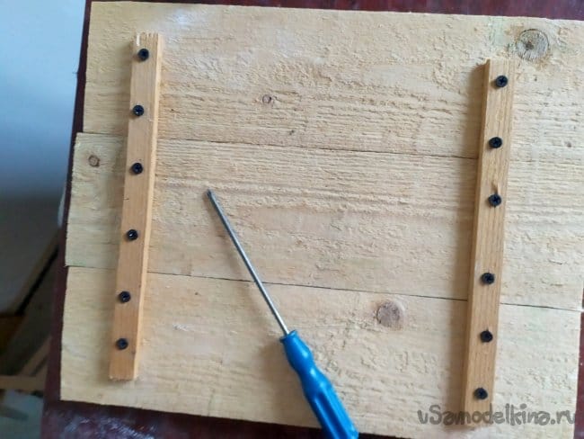 Когда отверстия готовы, я вкручиваю по два самореза на каждую доску, с двух сторон.