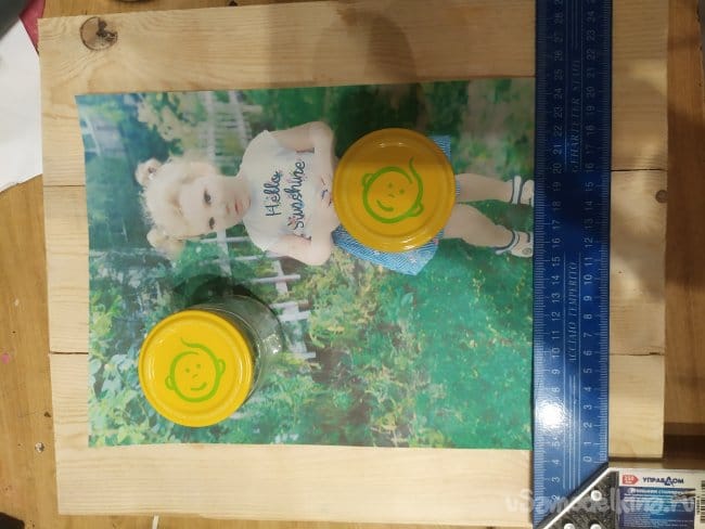 Теперь, прикладываем фотографию к дереву, и с помощью угольника, измеряем и определяем ее будущее расположение. Когда это готово, можно поставить какой-нибудь груз, чтобы фотография не убежала.