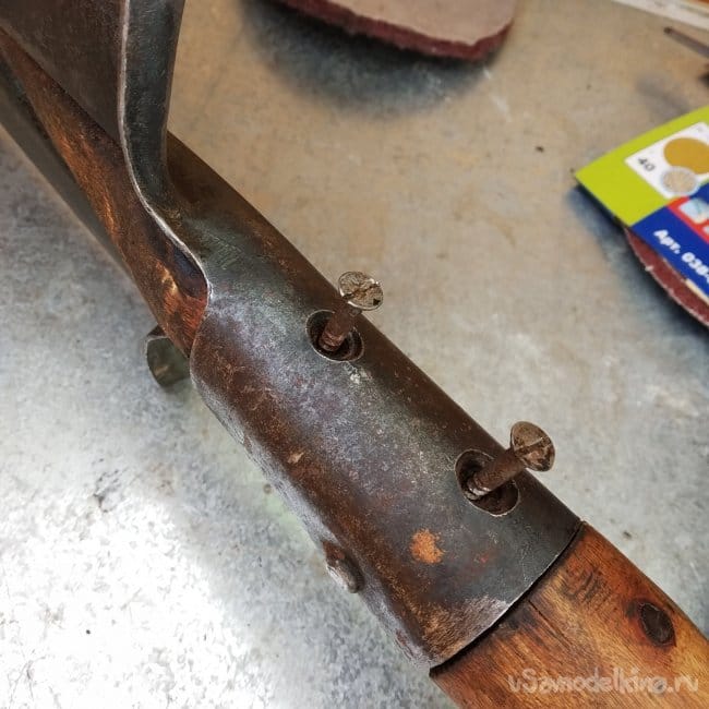 Сначала я заметил два шурупа сбоку лопаты. Я их решил выкрутить и снять черенок для более эффективной очистки от грязи и для восстановления лопаты по частям. Но черенок оказался сильнее, и я не отделить его от лопаты даже молотком, предварительно завернутым в тряпочку для безопасности лопаты и самого инструмента.