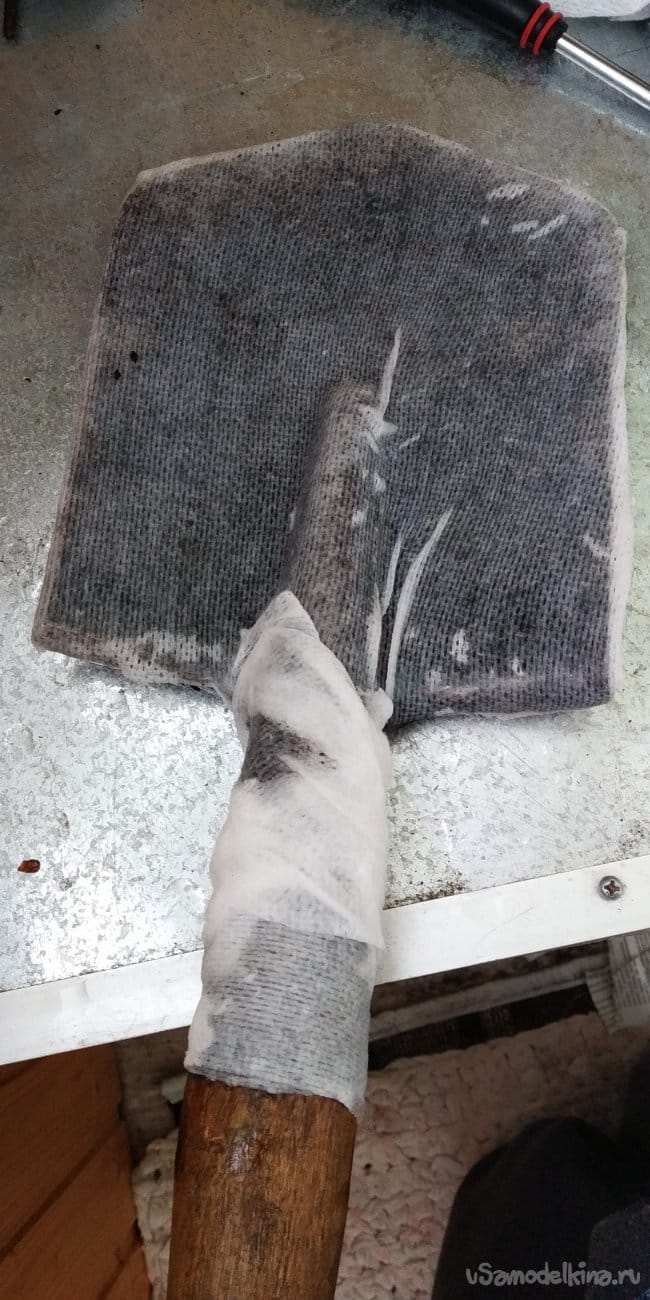 Поскольку на лопате есть ярко выраженные очаги ржавчины, я решил замотать всё это дело в непонятные «супер тряпки» (обходя деревянные части), и, опять-таки, пропитать их сильной лимонной кислотой.