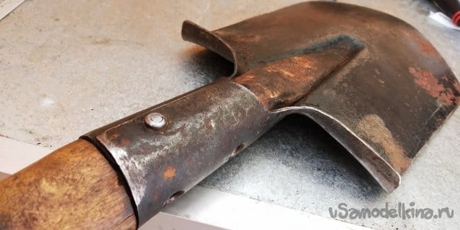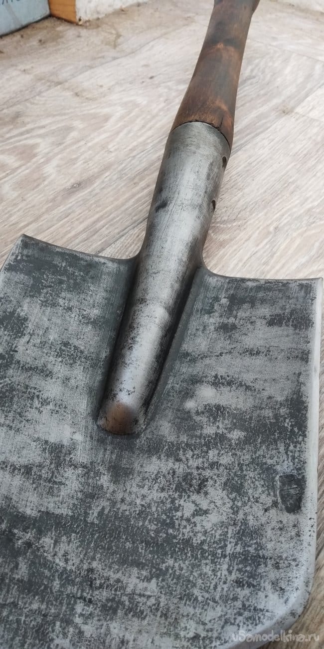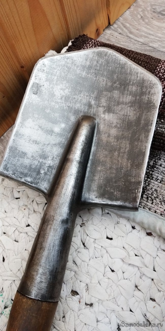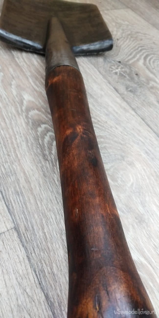 Далее я просто покрыл ручку вместе с лопатой (не знаю почему, захотелось) лаком, который в дальнейшем помешает мне запатинировать саму лопату. Впрочем, фиг с ним.