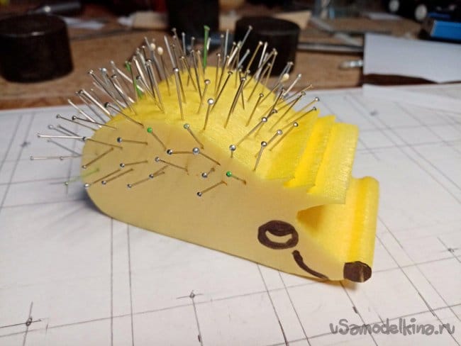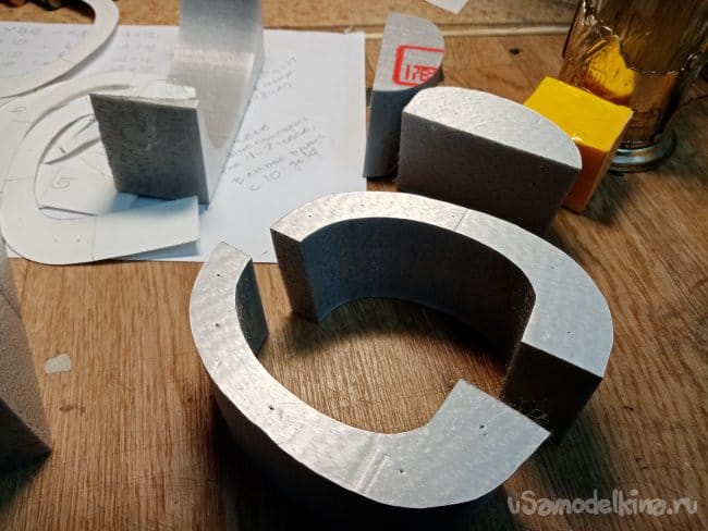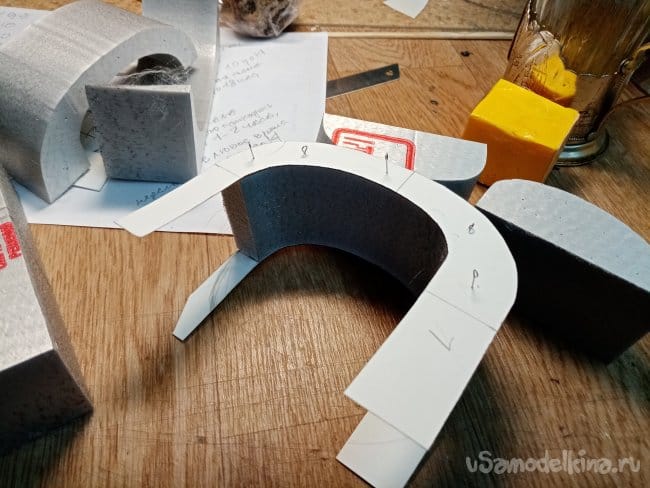 Шаблоны вырезал из полукартона весом в 250 грамм. Грани натер мягким карандашом 8Н. На пенопласте закреплял иголками из ежика.