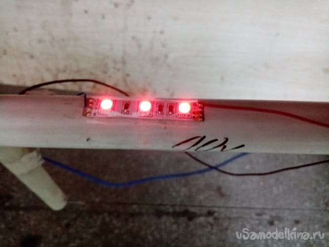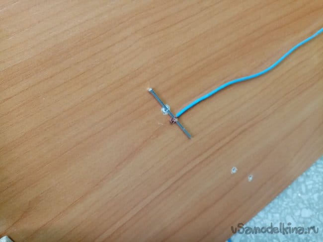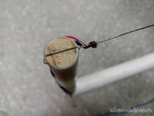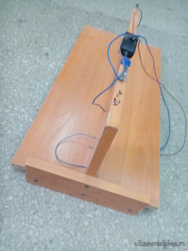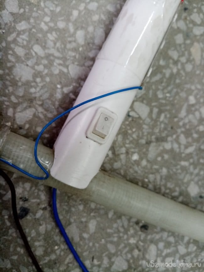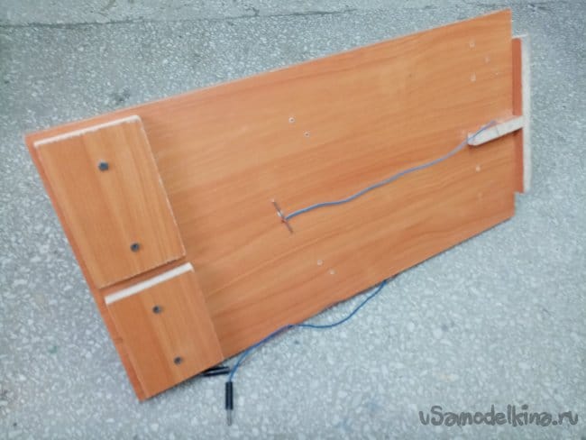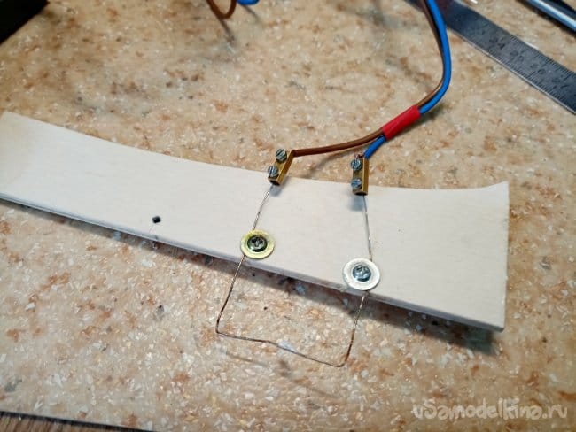 В торцы вертикальных элементов вставлены деревянные заглушки. Струна из нихрома 05. Её крепление выведено на самые концы трубок для удобства работы. Поставлен выключатель от лампы и контрольные светодиоды. Поскольку у меня было несколько попыток схватиться за раскаленную струну руками.