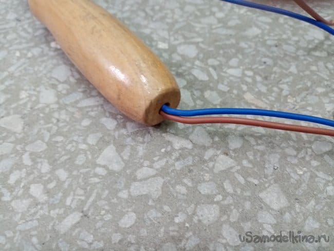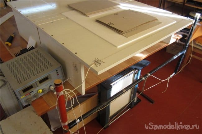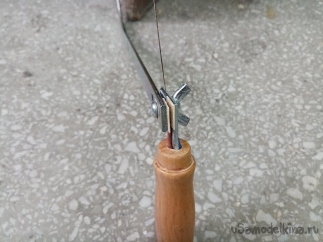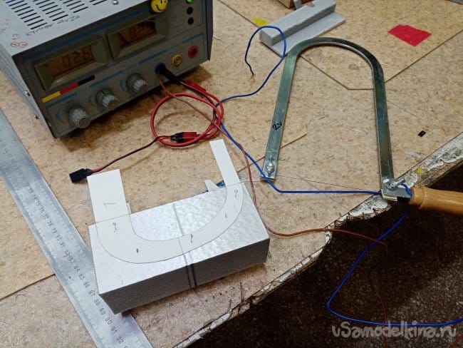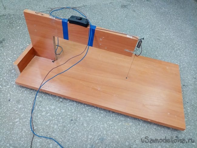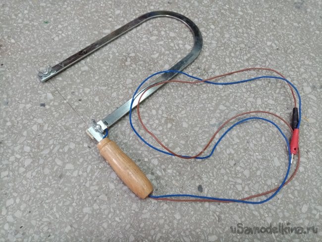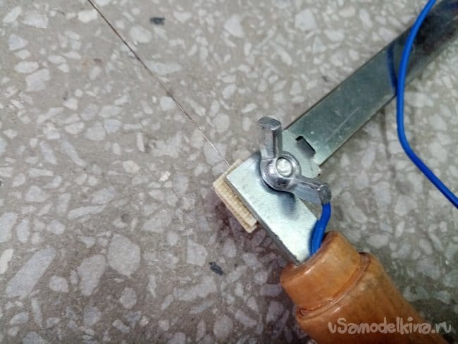 Изготовлен на базе обыкновенного лобзика. В рукоятке просверлено отверстие, для проводов. Один полюс нихромовой струны 05 защищен изоляцией из стеклотекстолита. Второй полюс заведен через корпус. Агрегат потребляет примерно 2 вольта и 1.5 ампера. Напряжение подается через мой любимый блок питания мощностью 30 вольт 3 ампера.