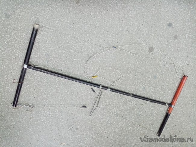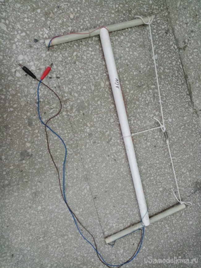 Так сказать резак собран по схеме стандартной лучковой пилы, из пропиленовой трубы (поперечный элемент) и стеклопластиковых трубок (вертикальные). Полипропилен работает только на сжатие, поскольку на изгиб он никакой. Стеклопластик понятно на изгиб.